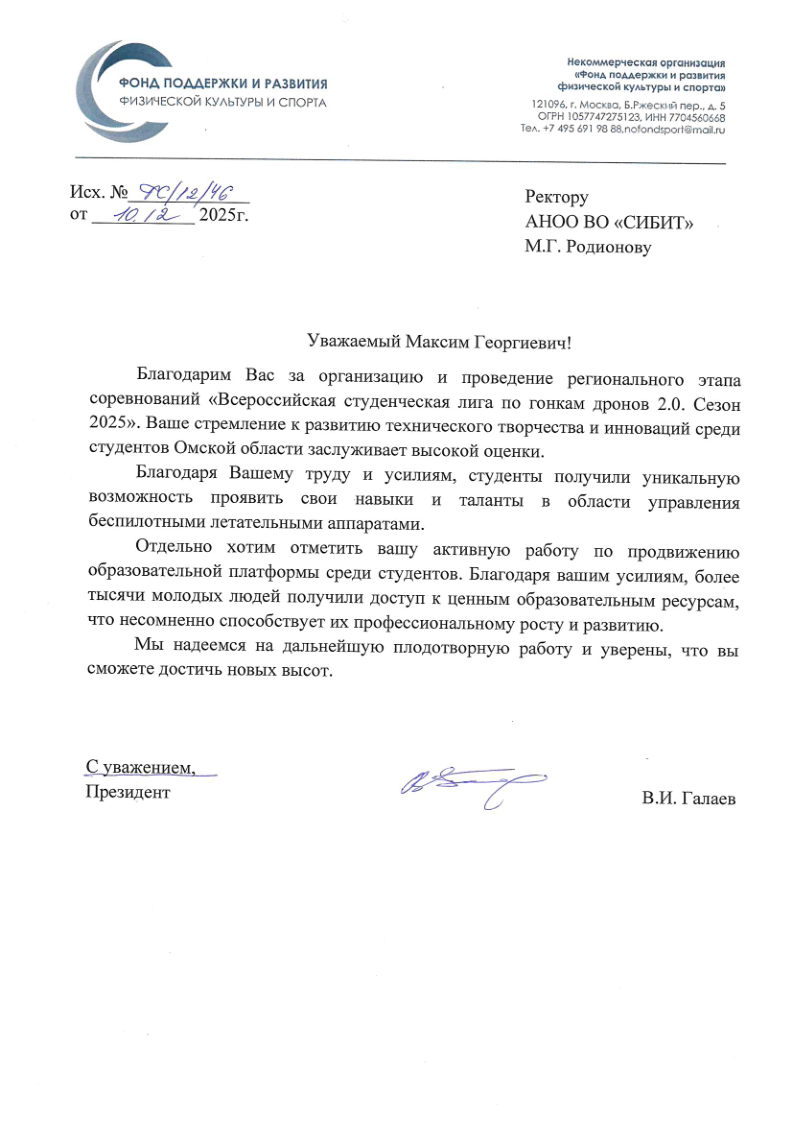 Сибирский институт бизнеса и информационных технологий получил официальное благодарственное письмо от В.И. Галаева за организацию и проведение регионального этапа соревнований «Всероссийская студенческая лига по гонкам дронов 2.0. Сезон 2025».